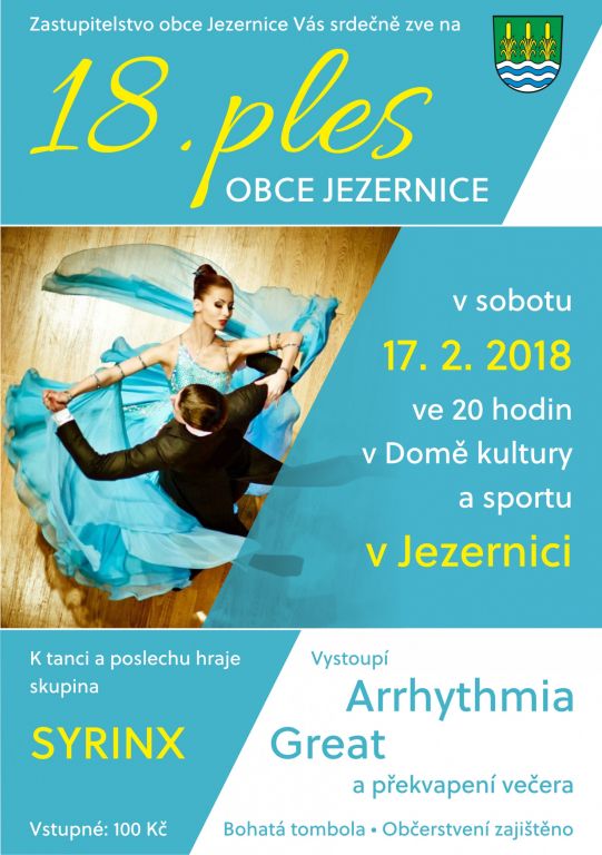 V sobotu 17. 2. 2018 ve 20 hod. v Domě kultury a sportu. Hraje skupina SYRINX. Vystoupí Arrhythmia, Great a překvapení večera. Vstupné 100 Kč. Občerstvení zajištěno. Srdečně Vás zve zastupitelstvo obce Jezernice.