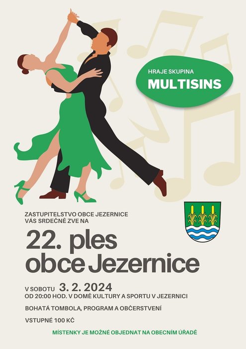 Zastupitelstvo obce Jezernice Vás srdečně zve na 22. ples obce Jezernice, který se koná v sobotu 3. 2. 2024 od 20 hodin v Domě kultury a sportu v Jezernici. Hraje skupina MULTISINS. Bohatá tombola, program a občerstvení zajištěno. Vstupné 100 Kč.