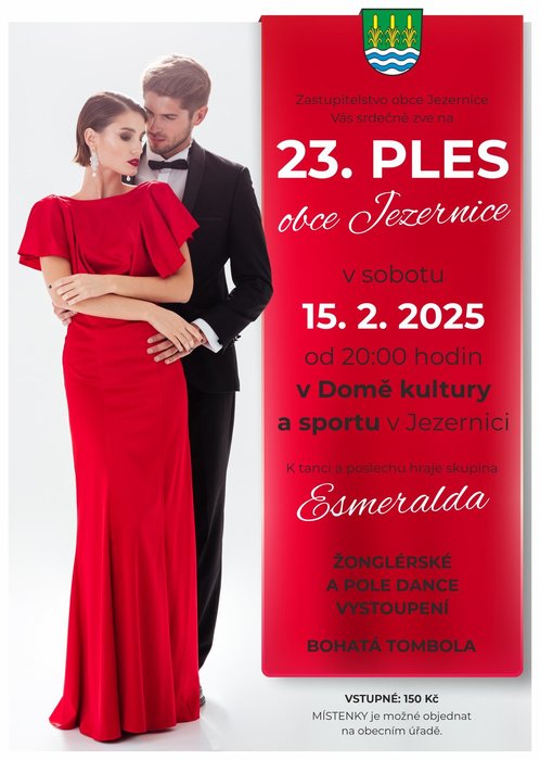 Zastupitelstvo obce Jezernice Vás srdečně zve na 23. ples obce Jezernice, který se koná v sobotu 15. 2. 2025 od 20:00 hodin v Domě kultury a sportu v Jezernici. K tanci a poslechu hraje skupina Esmeralda. Žonglérské a POLE DANCE vystoupení, bohatá tombola. Vstupné 150 Kč. Místenky je možné objednat na obecním úřadě.
