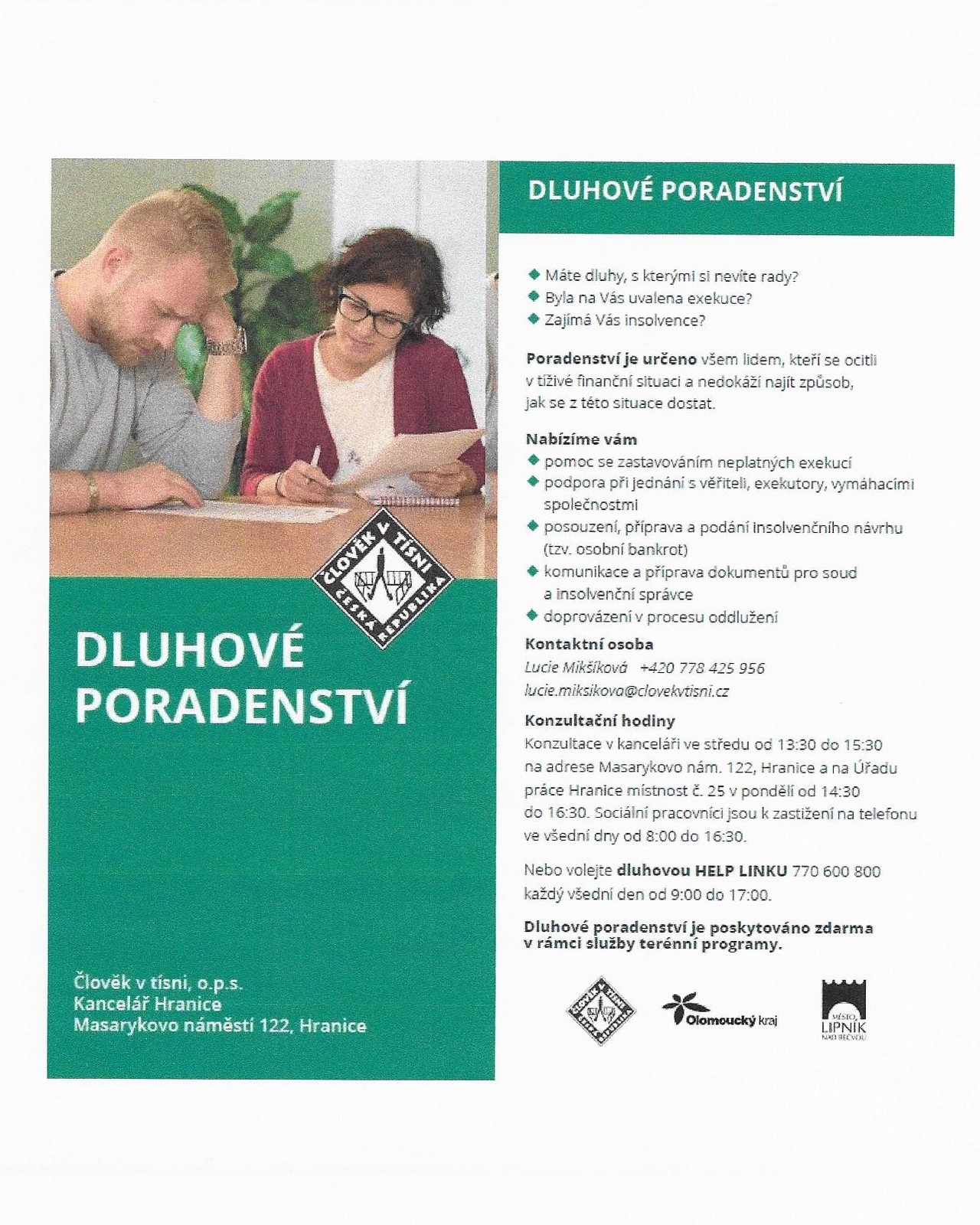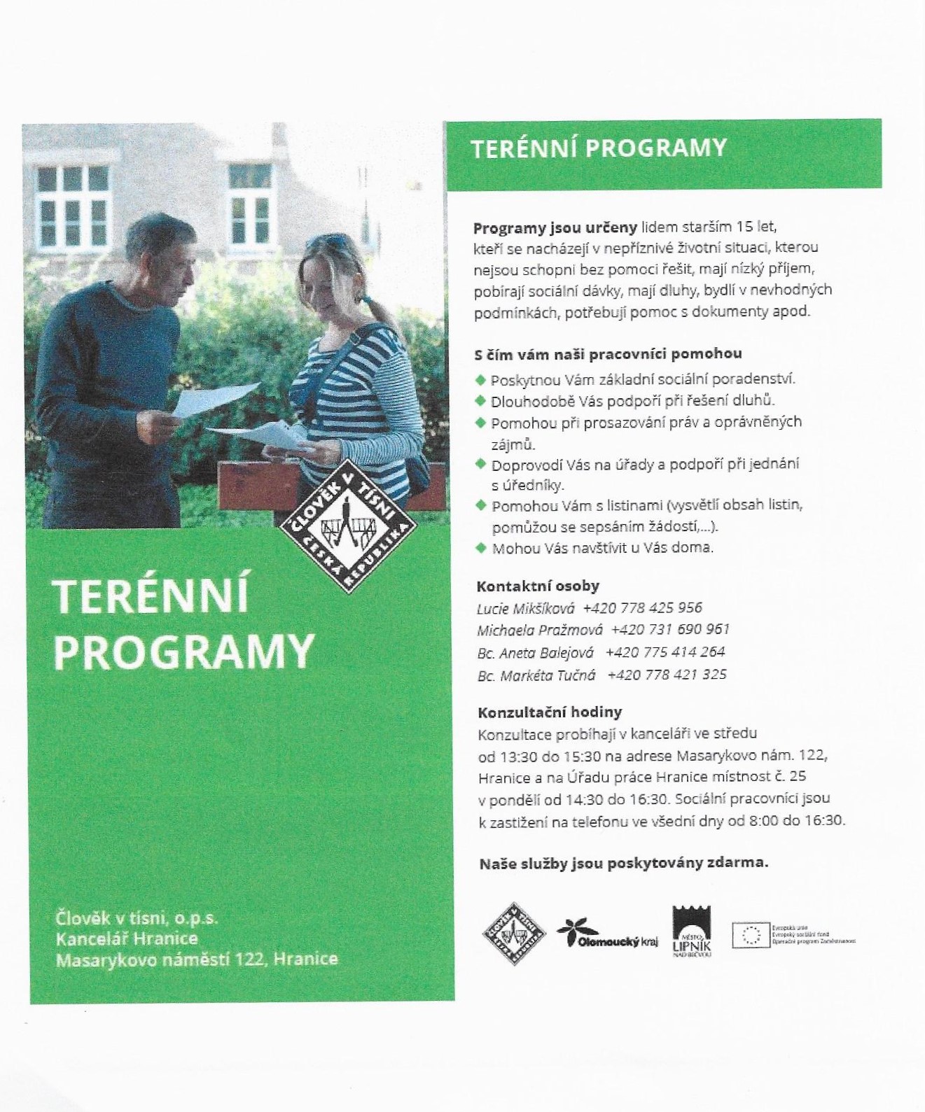 Člověk v tísni, o.p.s., kancelář Hranice, Masarykovo náměstí 122, Hranice - zdarma poskytováno v rámci služby terénní programy základní sociální poradenství, dluhové poradenství, pomoc při prosazování práv a oprávněných zájmů, doprovod na úřady a podpora při jednání s úředníky, pomoc s listinami. Mohou Vás navštívit u Vás doma. Konzultace v kanceláři ve středu od 13:30 do 15:30 na adrese Masarykovo nám. 122, Hranice a na Úřadu práce Hranice místnost č. 25 v pondělí od 14:30 do 16:30. Sociální pracovníci jsou k zastižení na telefonu +420778425956, +420731690961, +420775414264, +420778421325 ve všední dny od 8:00 do 16:30. V případě dluhového poradenství můžete volat i HELP LINKU +420770600800 každý všední den od 9:00 do 17:00 hod. Více informací v přiložených letáčcích.