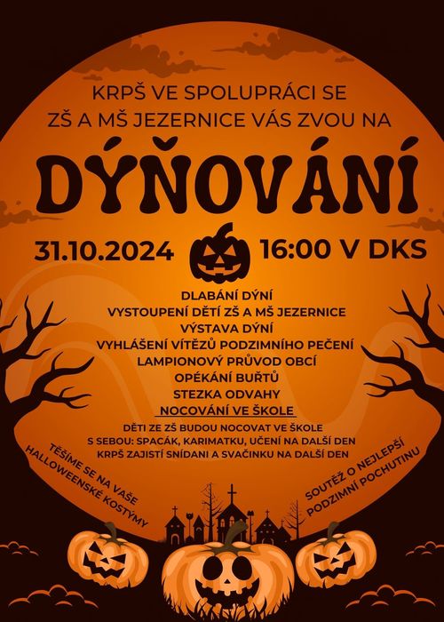 KRPŠ ve spolupráci se ZŠ a MŠ Jezernice Vás zvou na Dýňování, které se koná ve čtvrtek 31.10.2024 v 16 hodin v Domě kultury a sportu v Jezernici.