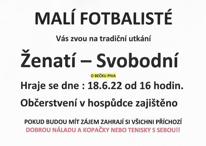 Malí fotbalisté Vás zvou v sobotu 18. 6. od 16 hodin do sportovního areálu na tradiční utkání Ženatí - Svobodní. Hraje se o bečku piva. Občerstvení v hospůdce zajištěno.