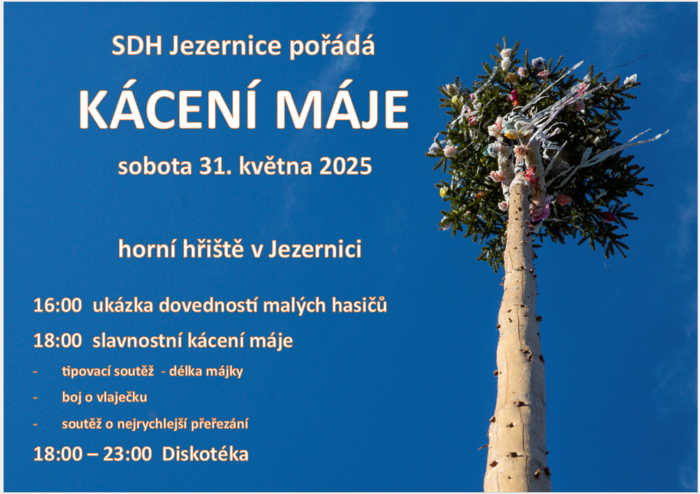 SDH Jezernice pořádá v sobotu 31. května 2025 na horním hřišti v Jezernici kácení máje. Začátek v 16 hodin, kácení máje v 18 hodin, poté následuje diskotéka. Srdečně zvou pořadatelé.
