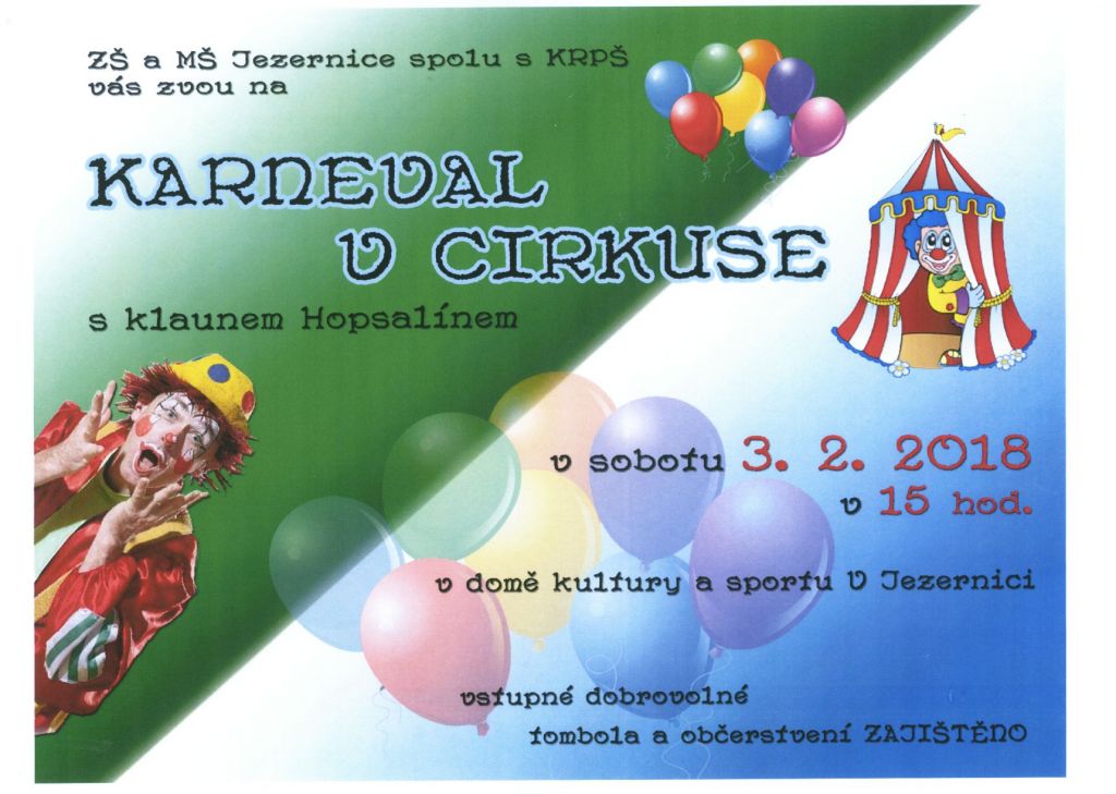 v sobotu 3. 2. 2018 v 15 hod. v Domě kultury a sportu. Vstupné dobrovolné. Zvou ZŠ a MŠ Jezernice spolu s KRPŠ.