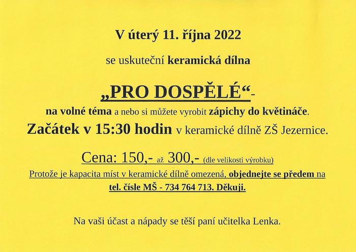 V úterý 11. 10. 2022 se uskuteční keramické dílna pro dospělé na volné téma a nebo si můžete vyrobit zápichy do květináče. Začátek v 15:30 hodin v keramické dílně ZŠ Jezernice. Cena 150 až 300 Kč. Objednejte se předem na tel. čísle MŠ 734 764 713.