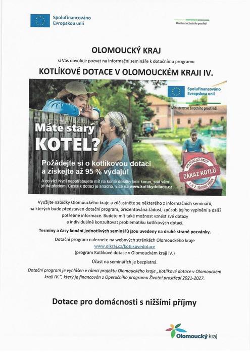Olomoucký kraj 10. 5. 2022 vyhlásil dotační program Kotlíkové dotace v Olomouckém kraji IV. Dotace bude možné čerpat na výměnu kotle na pevná paliva nesplňujícího 3., 4. a 5. emisní třídu za nový ekologický zdroj.