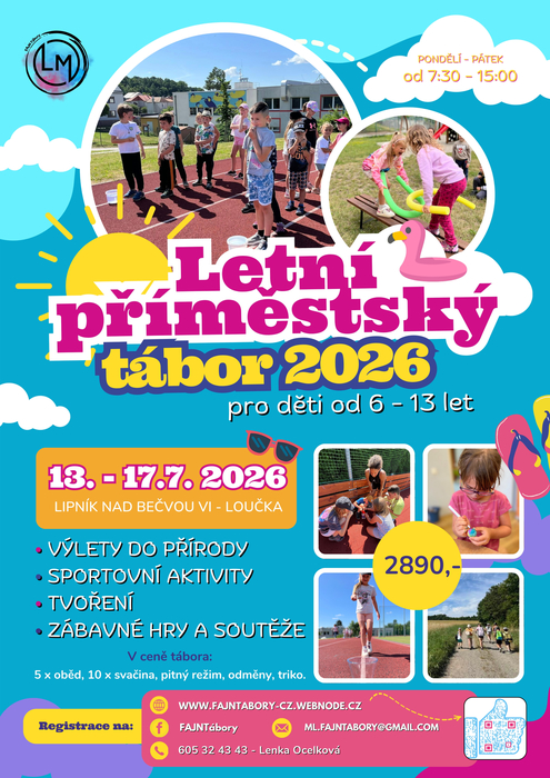 Letní příměstský tábor 2026 - Lipník nad Bečvou VI-Loučka pro děti od 6-13 let se koná ve dnech 13.-17. 7. 2026, pondělí - pátek od 7:30 - 15:00 hodin.