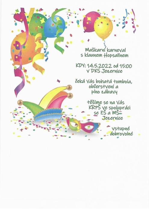 KRPŠ ve spolupráci se ZŠ a MŠ Jezernice pořádá 14. 5. 2022 od 15 hodin v DKS maškarní karneval s klaunem Hopsalínem