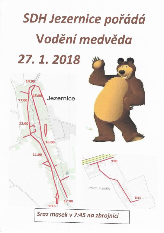 V sobotu 27. 1. 2018 pořádá SDH Jezernice. Sraz masek v 7:45 hod. na zbrojnici.