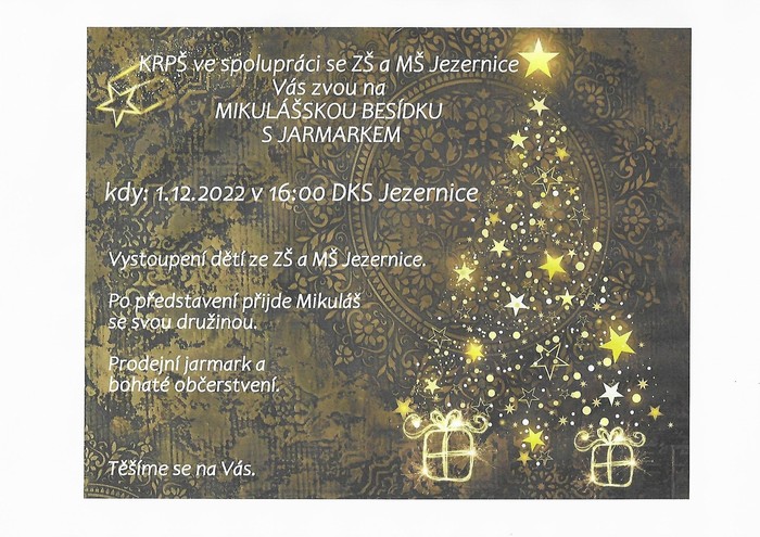 KRPŠ ve spolupráci se ZŠ a MŠ Jezernice Vás zvou na Mikulášskou besídku s jarmarkem, která se koná ve čtvrtek v 16 hodin v Domě kultury a sportu Jezernice. Se krátkým programem vystoupí děti ze ZŠ a MŠ Jezernice, poté přijde Mikuláš se svou družinou. Je připraveno bohaté občerstvení a prodejní jarmark.