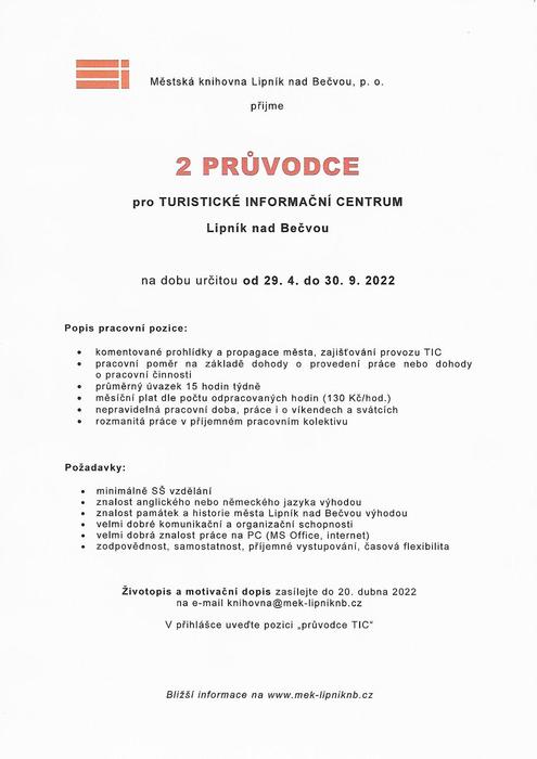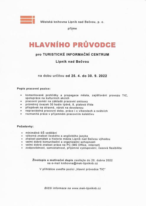 Městská knihovna Lipník nad Bečvou, p.o. přijme hlavního průvodce a 2 průvodce pro Turistické informační centrum na dobu určitou.