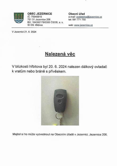 V blízkosti hřbitova byl 20. 6. 2024 nalezen dálkový ovladač k vratům nebo bráně s přívěskem. Majitel si ho může vyzvednout na Obecním úřadě v Jezernici, Jezernice 206.