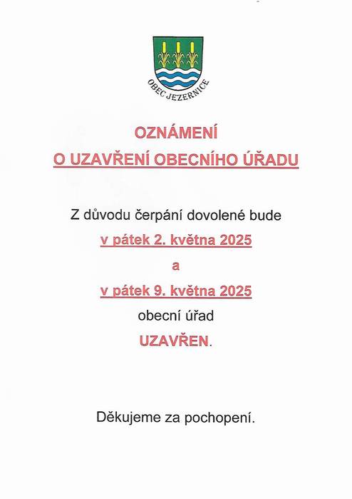 Z důvodu čerpání dovolené bude v pátek 2. 5. a 9. 5. 2025 obecní úřad v Jezernici uzavřen. Děkujeme za pochopení.