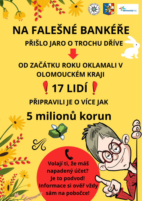 A že se jim daří!!! Jen v Olomouckém kraji telefonicky hovořilo s falešným bankéřem letos už nejméně 17 poškozených lidí. Z jejich kont následně vlastním přičiněním zmizelo přes 5 milionů korun. V loňském roce jsme v kraji evidovali 93 takovýchto případů se škodou převyšující 16 milionů korun.
