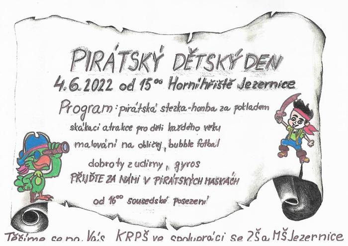 V sobotu 4.6.2022 od 15 hodin na horním hřišti v Jezernici pořádá KRPŠ ve spolupráci se ZŠ a MŠ Jezernice PIRÁTSKÝ DĚTSKÝ DEN. Přijďte v pirátských maskách. Od 16 hodin sousedské posezení.