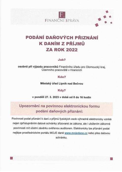 V pondělí 27. 3. 2023 v době od 8 do 16 hodin budou pracovníci Finančního úřadu pro Olomoucký kraj, Územní pracoviště v Hranicích, v prostorech Městského úřadu města Lipník nad Bečvou vybírat daňová přiznání k daním z příjmů za rok 2022 a další podání a poskytovat konzultaci občanů se správcem daně.