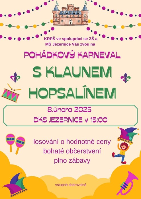 KRPŠ ve spolupráci se ZŠ a MŠ Jezernice Vás zvou na POHÁDKOVÝ KARNEVAL S KLAUNEM HOPSALÍNEM, který se koná 8. února 2025 v 15 hodin v Domě kultury a sportu v Jezernici. Čeká Vás plno zábavy, losování o hodnotné ceny a bohaté občerstvení. Vstupné dobrovolné.
