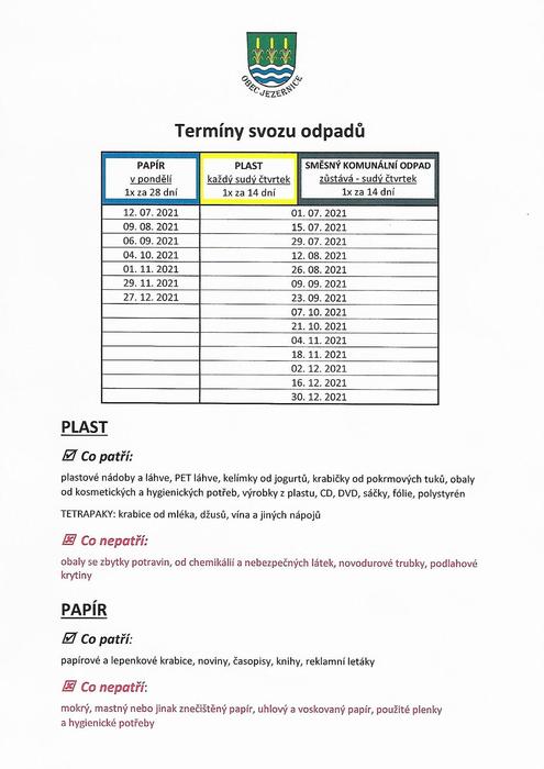 Z důvodu změny tras společnosti AVE se mění termín svozu plastu v Jezernici. Od tohoto týdne bude prováděn ve stejný den jako směsný komunální odpad, každý sudý čtvrtek.