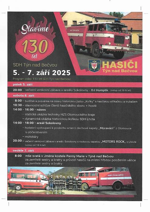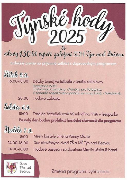 Obec Týn nad Bečvou Vás srdečně zve na Týnské hody a Oslavy 130 let SDH Týn nad Bečvou, které se uskuteční 5. – 7.9.2025.