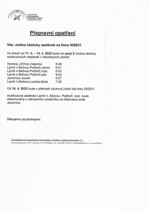 KIDSOK zveřejňuje přepravní opatření týkající se změny obsluhy zastávek na lince 920531 ve dnech 11. 4. 2022 – 14. 4. 2022 v důsledku uzavírky silnic mezi obcemi Loučka, Podhoří, Milenov a Středolesí.