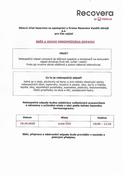V sobotu 18.10.2025 proběhne sběr nebezpečného odpadu, a to od 10.00-11:10 hod POUZE v areálu ČOV. Neodkládejte odpady na svozové místo předem.