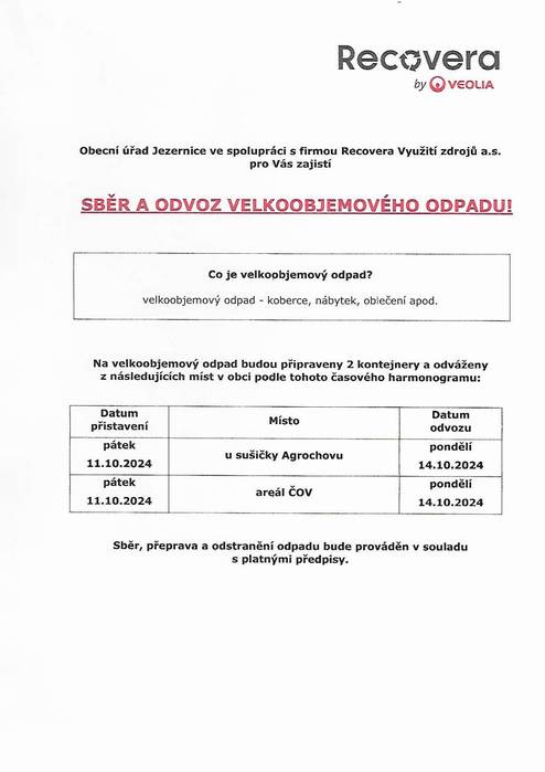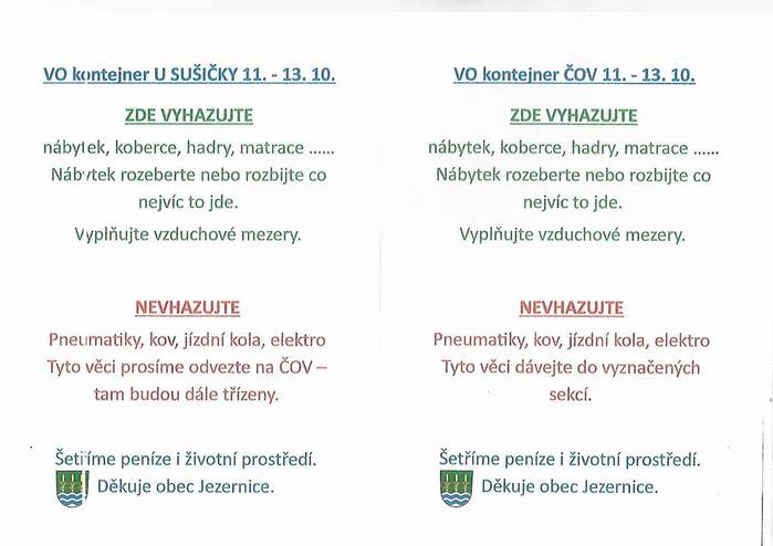 Ve dnech 11.-13.10.2024 budou přistaveny v areálu Agrochovu u sušičky a v areálu ČOV kontejnery na velkoobjemový odpad (koberce, nábytek, oblečení apod). Nábytek rozeberte nebo rozbijte. Nevhazujte pneumatiky, kov, jízdní kola, elektro. Tyto věci odvezte na ČOV, tam budou dále třízeny.