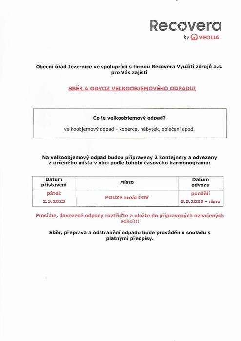 V pátek 2.5.2025 budou v obci přistaveny kontejnery na velkoobjemový odpad (koberce, nábytek, oblečení apod), a to POUZE v areálu ČOV .