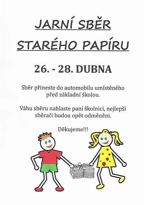 Ve dnech 26 . až 28. dubna proběhne sběr starého papíru. Před základní školou bude přistaveno nákladní auto, do kterého sběr ukládejte. Utržené peníze půjdou opět na nákup materiálu pro žáky. Pozor, sběr bude jen 2 a půl dne!
