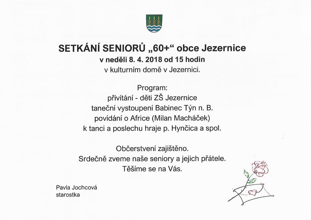 v neděli 8. 4. 2018 od 15 hodin v kulturním domě v Jezernici. Program a občerstvení zajištěno. Těšíme se na Vás.