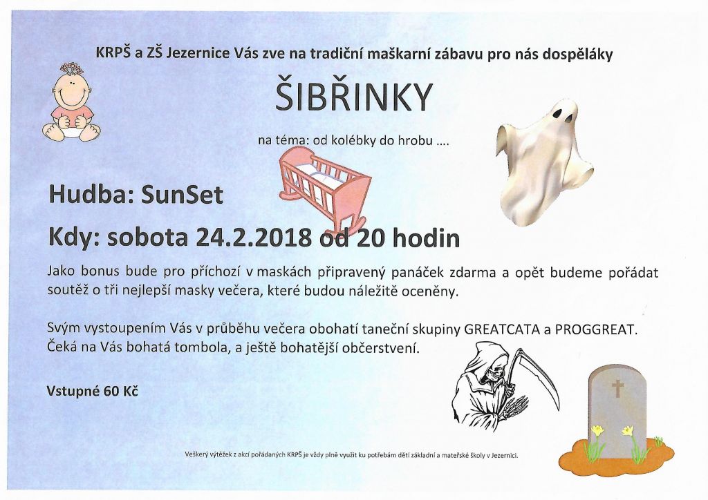 V sobotu 24. 2. 2018 od 20 hodin v DKS. Hraje skupina SunSet. Vystoupí taneční skupiny Greatčata a Proggreat. Bohaté občerstvení zajištěno. Vstupné 60 Kč. Zve KRPŠ a ZŠ a MŠ Jezernice.