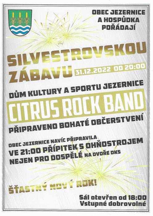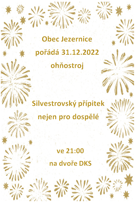 Obec Jezernice pořádá silvestrovský přípitek s ohňostrojem na dvoře domu kultury a sportu Jezernice. Přípitek nejen pro dospělé, šampáňo a rychlé špunty zajištěny. Dvůr bude zpřístupněn, není nutno účastnit se zábavy viz. níže. Ohňostroj proběhne ve 21:00. Současně Hospůdka a Obec pořádají od 18:00 Silvestrovskou zábavu s kapelou Citrus. Na tuto akci je doporučeno domluvit si rezervaci místa k sezení u provozních v Hospůdce. Těší se Obec Jezernice.