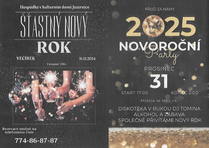 Hospůdka v DKS pořádá 31. 12. 2024 silvestrovský večírek v DKS. Začátek v 17 hodin, diskotéka v rukou DJ Tomina, vstupné 100 Kč. Rezervace na tel. č. 774 86 87 87.