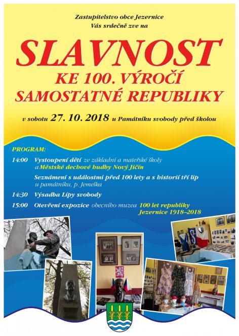 V sobotu od 14 hodin Vás Zastupitelstvo obce Jezernice srdečně zve na slavnost u památníku před školou a na výsadbu památné lípy.