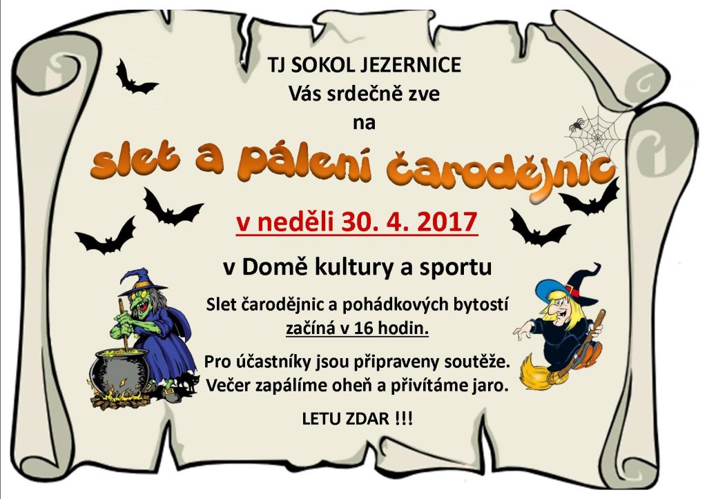 v neděli 30. 4. 2017 od 16 hodin v Domě kultury a sportu. Pro účastníky jsou připraveny soutěže, večer zapálíme oheň a přivítáme jaro. Srdečně zve TJ Sokol Jezernice.