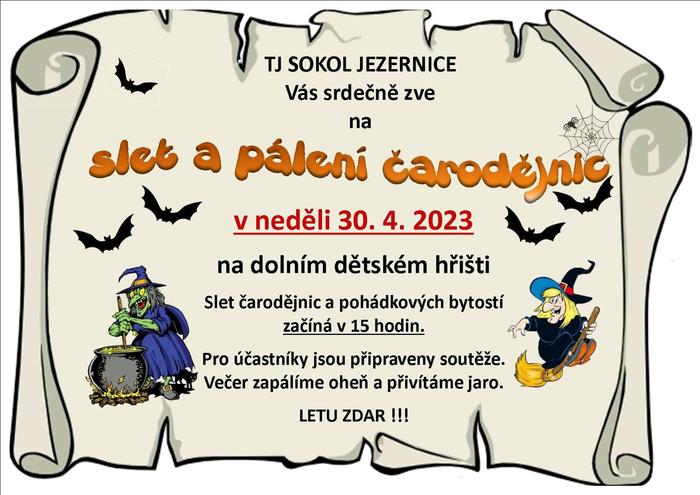 Slet a pálení čarodějnic v Jezernici se koná v neděli 30. dubna 2023 od 15 hodin na dolním dětském hřišti.