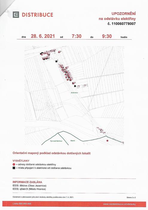 ČEZ Distribuce, a.s. informuje o plánovaném přerušení dodávky elektrické energie v katastru obce Jezernice a Slavíč dne 28. 6. 2021 od 7:30 do 9:30 hodin.