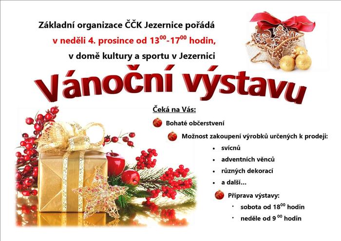 ZO ČČK Jezernice Vás srdečně zve na vánoční výstavu, která se koná v neděli 4. 12. 2022 od 13 do 17 hodin v Domě kultury a sportu v Jezernici . Bude připraveno bohaté občerstvení s možností zakoupení výrobků určených k prodeji. Příprava výstavy: sobota od 18 hodin, neděle od 9 hodin.