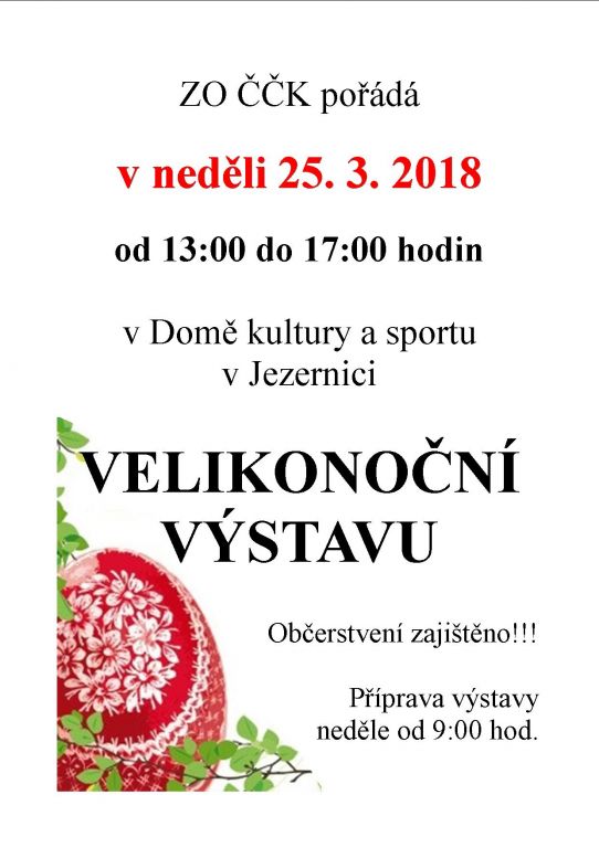 od 13 do 17 hodin v Domě kultury a sportu v Jezernici. Občerstvení zajištěno. Příprava výstavy neděle od 9 hodin. Zve ZO ČČK