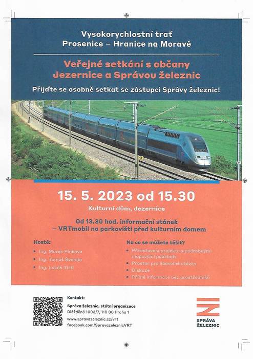 Veřejné setkání s občany Jezernice a Správou železnic týkající se vysokorychlostní tratě Prosenice - Hranice se uskuteční v pondělí 15.5.2023 od 15.30 hod. v Domě kultury a sportu v Jezernici. Od 13.30 hod. budete na parkovišti před DKS v provozu informační stánek - VRT mobil. Přijďte se osobně setkat se zástupci Správy železnic.