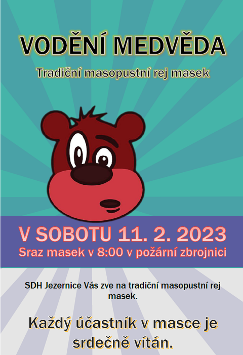 SDH Jezernice Vás zve v sobotu 11. 2. 2023 na tradiční vodění medvěda. Sraz masek v 8 hodin v požární zbrojnici.