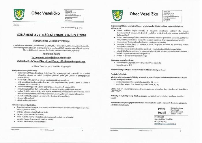 Obec Veselíčko vyhlašuje konkursní řízení na pracovní místo ředitele / ředitelky Mateřská škola Veselíčko, okres Přerov, příspěvková organizace, se sídlem Tupec 40, 751 25 Veselíčko, IČ: 75029961