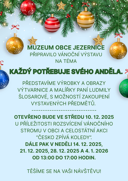 Muzeum obce Jezernice připravilo vánoční výstavu na téma "Každý potřebuje svého anděla". Představíme výrobky a obrazy výtvarnice a malířky paní Ludmily Šlosarové, s možností zakoupení vystavených předmětů. Otevřeno ve středu 10.12. při příležitosti akce Česko zpívá koledy a pak v neděli 14.12., 21.12., 28.12.2025 a 4.1.2026 od 13 do 17 hodin.