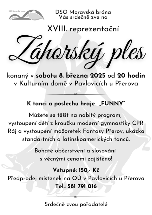 DSO Moravská brána Vás srdečně zve na XVIII. reprezentační Záhorský ples, který se koná 8. března 2025 od 20 hodin v Kulturním domě v Pavlovicích u Přerova. Vstupné 150 Kč. Předprodej místenek na OÚ v Pavlovicích u Přerova, tel. 581 791 016.