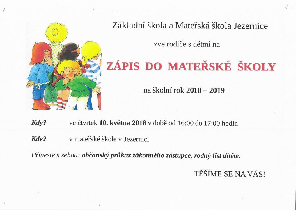 Ve čtvrtek 10. 5. 2018 v době od 16:00 do 17:00 hodin v mateřské škole Jezernice. Přineste s sebou občanský průkaz zákonného zástupce a rodný list dítěte.