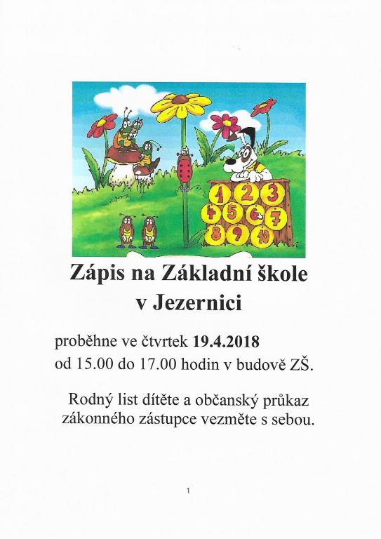proběhne ve čtvrtek 19. 4. 2018 od 15 do 17 hodin v budově ZŠ. Rodný list a občanský průkaz zákonného zástupce vezměte s sebou.