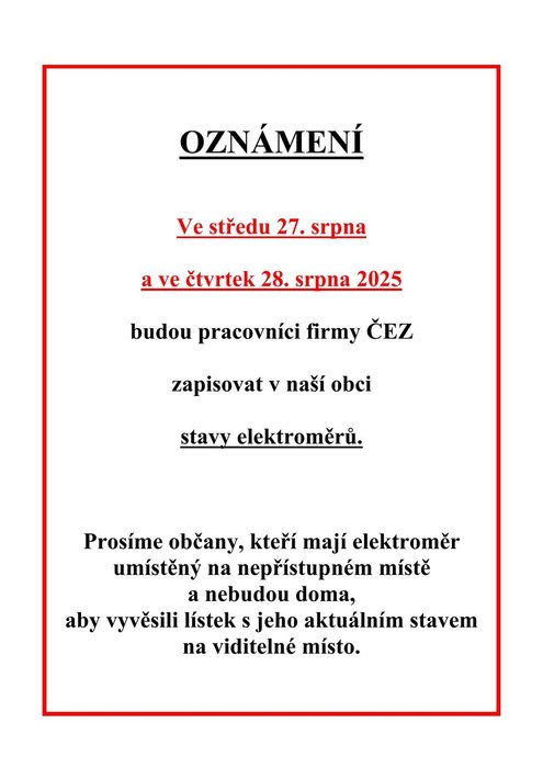 Ve dnech 27. a 28. srpna 2025 budou pracovníci firmy ČEZ zapisovat v obci stavy elektroměrů. Pokud máte elektroměr nepřístupný, vyvěste lístek s aktuálním stavem na viditelné místo.